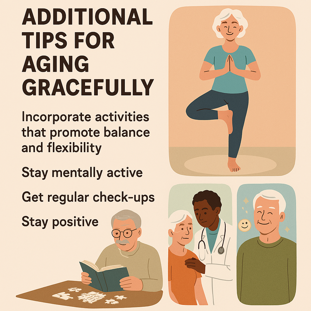 Aging gracefully while staying active requires a combination of physical activity, healthy habits, and mental and emotional well-being. By incorporating these secrets and tips into your lifestyle, you can maintain your physical and mental health, and enjoy a happy and healthy life.